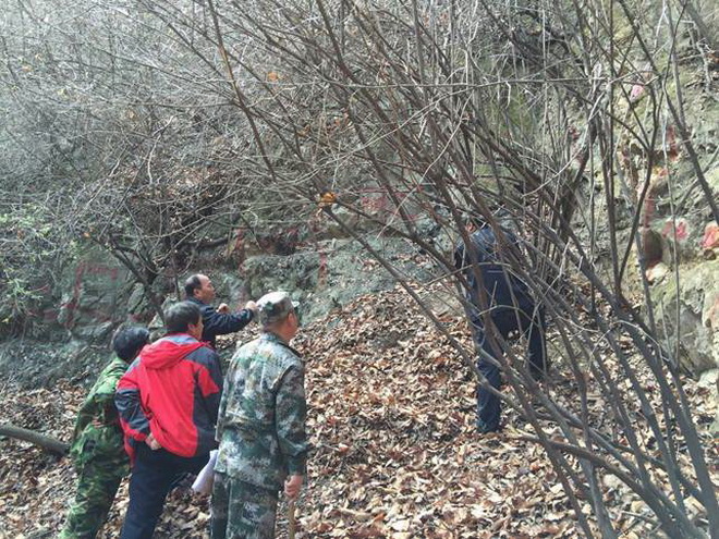 24日一大早,冒著零星小雨,王隊長一行不顧沿途勞累,馬不停蹄趕赴大官長西溝一帶查看礦帶情況。1998年前后,王隊長曾經在工作區周邊的佛坪一帶從事1:5萬區調工作,創名并建立了佛坪、長角壩巖群,為一套富鋁含石墨的孔茲巖系,與本區發現的富含矽線石的晶質石墨礦帶成分非常相近。此次來留壩,已是王隊長第二次前往留壩項目工區檢查指導工作了,對該地段的地質情況也比較了解。一路上隊長興致很高,和項目組人員愉快交談,詳細詢問路過地段可能形成礦化的斷裂等地質情況及項目組人員的組成、年輕同志的成長進步情況。通過近兩個多小時的跋山涉水,十點半左右到達西溝石墨礦帶地段,王隊長在仔細查看礦帶厚度、產狀等基本情況后,對工程的施工質量及采樣方法提出了具體要求,并就從區域范圍上對石墨礦帶的賦礦層位與項目組人員交流觀點和看法。
