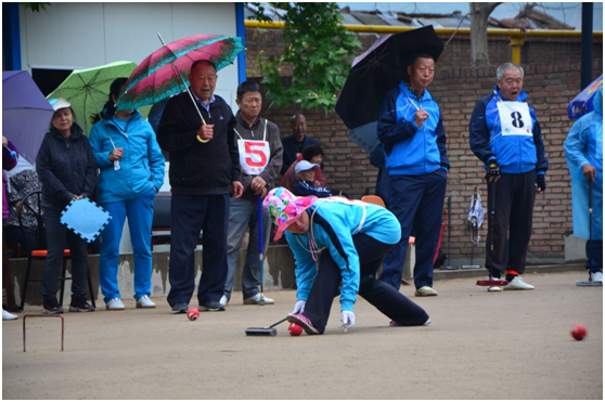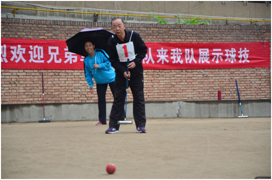 門球場上,隊員們個個精神煥發,手握重槌,氣定神閑,揮桿對壘沉著冷靜,彎腰擊球也顯得身手矯健,擊球力度和角度都控制得非常精準,毫不遜色于年輕人。“過門”、“撞擊”、“閃擊”,充分展現了“壯心未與年俱老”的“夕陽紅”活力。